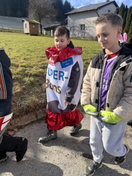 Danes je bilo na POŠ Vuhred še posebej živahno in razigrano. Zjutraj so skozi šolska vrata vstopile pisane maske, veliko smeha in dobre volje. Skupaj z maskami vrtca smo se odpravili na veseli pustni sprehod po Vuhredu. Nekateri krajani so nas na poti prijazno pričakali in obdarili s sladkarijami, ki so še dodatno polepšale že tako sladko pustno dopoldne.